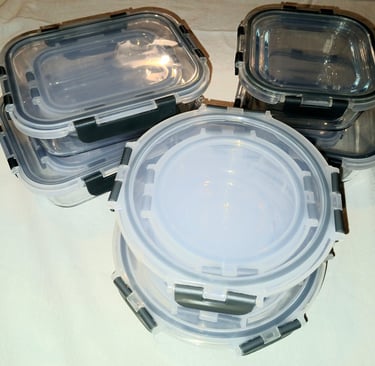 I have recently made the switch from plastic food containers to glass. So far I'm quite pleased with these. It comes with 15 containers and they fit nicely into each other with the lids on (as shown above.) So no more searching for the lids of each container! The larger containers in this set are bigger than most of the other brands I looked at, which was what made me go with these. They are also very reasonably priced and our left overs not tasting like plastic is a plus!