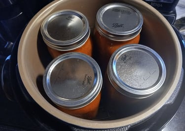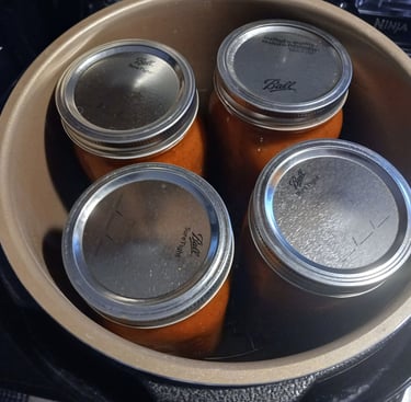 When pressure canning I fill my sterilized Jars with the hot sauce. Make sure the wiped and clean so nothing interferes with the seal. I then place on my clean lids and rings. Tighten to finger tip tight. Place your hot Jars into your pressure canner. Fill with the proper amount of water for your machine and pressure can quarts for 25 minutes or pints for 20. Again these times are for pressure canning the times will be different for water bath canning. Please do your research for proper canning time using a water bath canner.