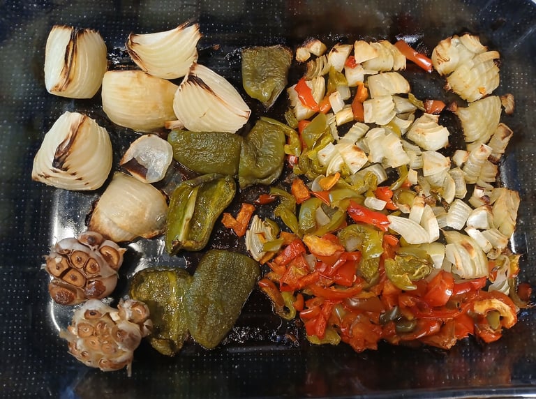 When veggies have finished roasting pull them out and let them cool down for a few minutes. Once they are cool add the large pieces of onion and peppers to the tomatoes sauce. You can squeeze the garlic heads and the insides should easily come out. I recommend doing this in a separate bowl so no unwanted pieces end up in the sauce. Once you have extracted the garlic from its shell add it to the sauce and use your Immersion blender to puree the veggies into the sauce (leaving out the Diced veggies). Once everything is smooth you can now add in your Diced veggies and your other ingredients. Stir it all together and continue to simmer UNCOVERED 6 - 8 hours, until you are happy with the consistency.